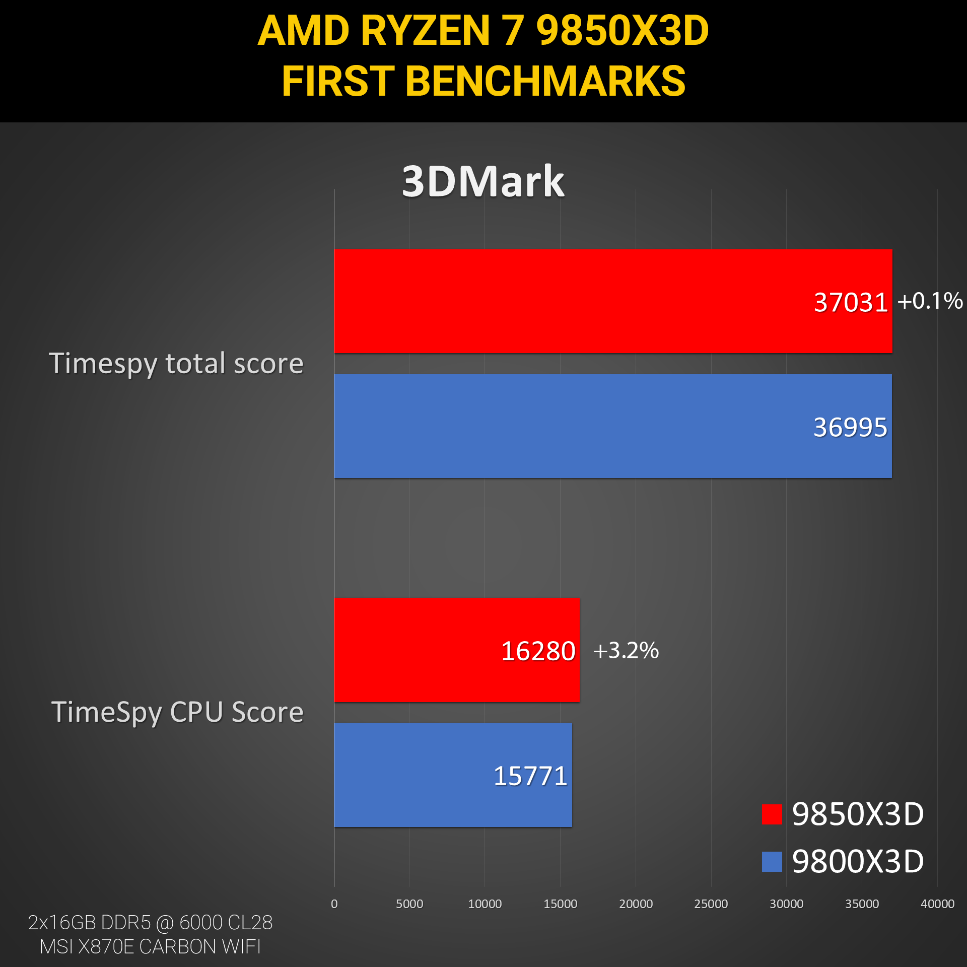 We were within margin of error for total score, and got a 3.2% better result on the CPU score with the 9850X3D