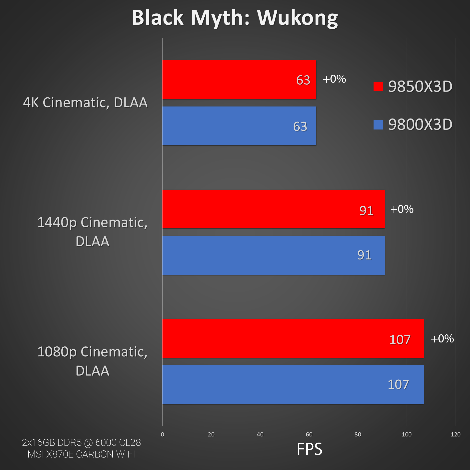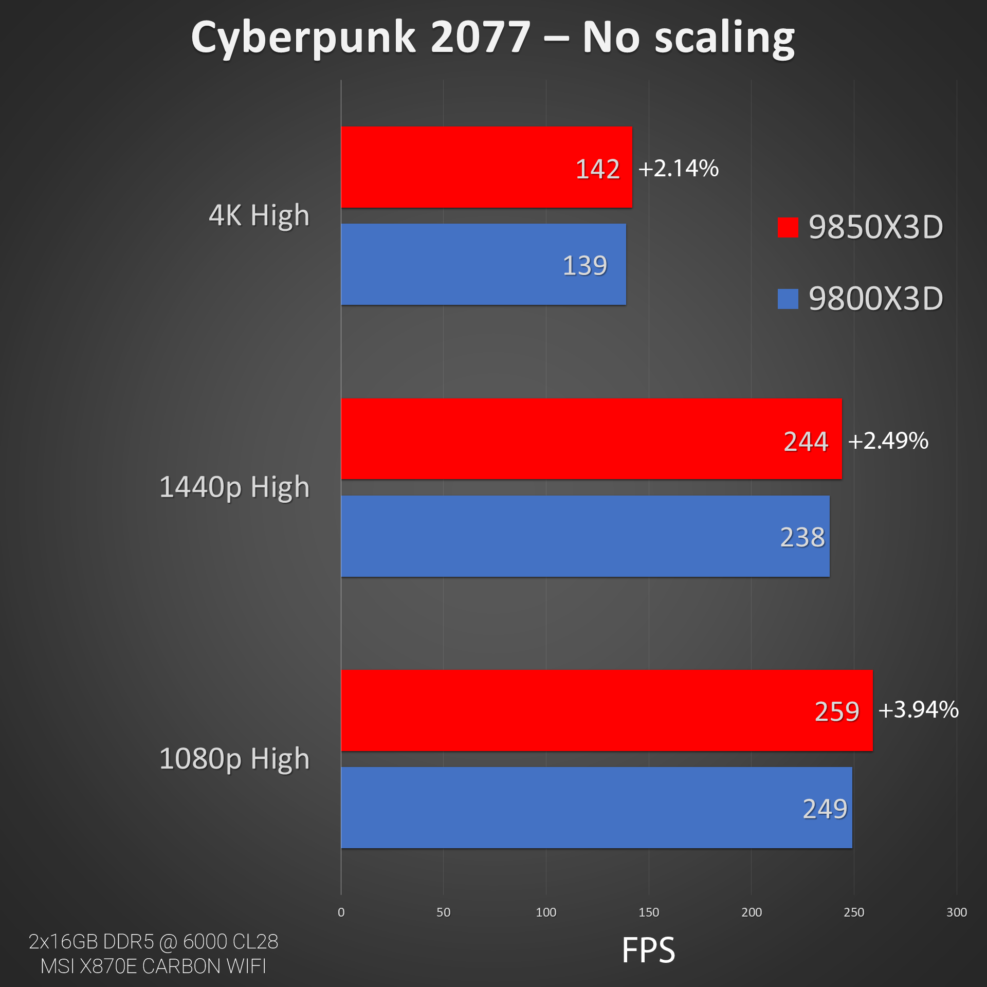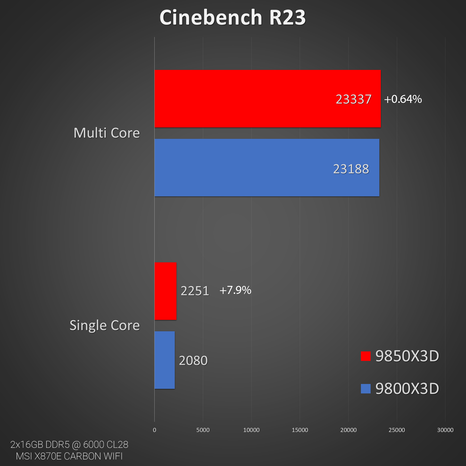 Going back to the synthetics, Cinebench, namely the Single core test, is where we got the biggest difference between these two CPUs, with the 9850X3D getting an almost 8% boost in score over its slightly less buff brother.