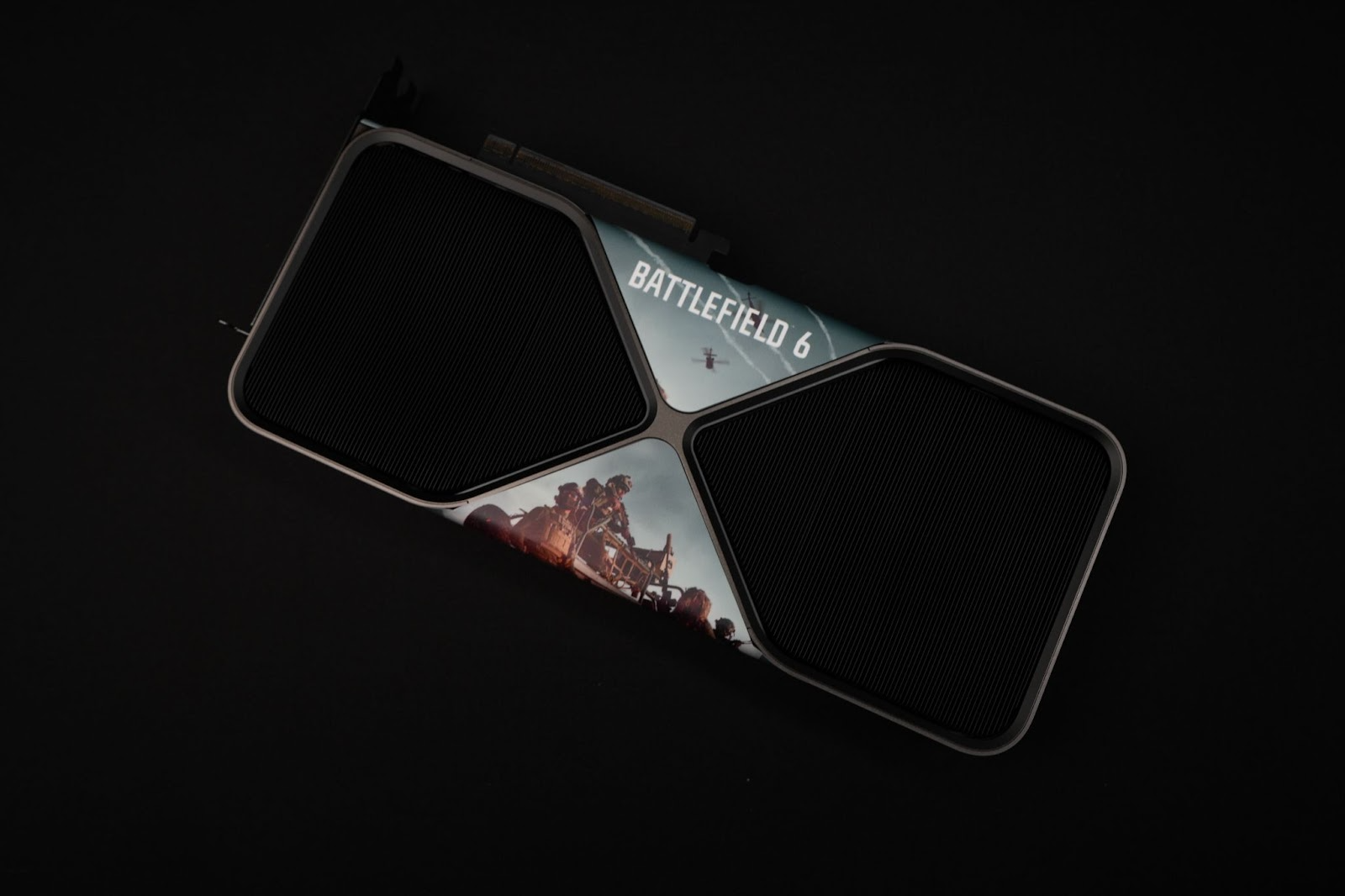 A Custom-wrapped, Battlefield 6 - themed GeForce RTX 5090 GPU.
