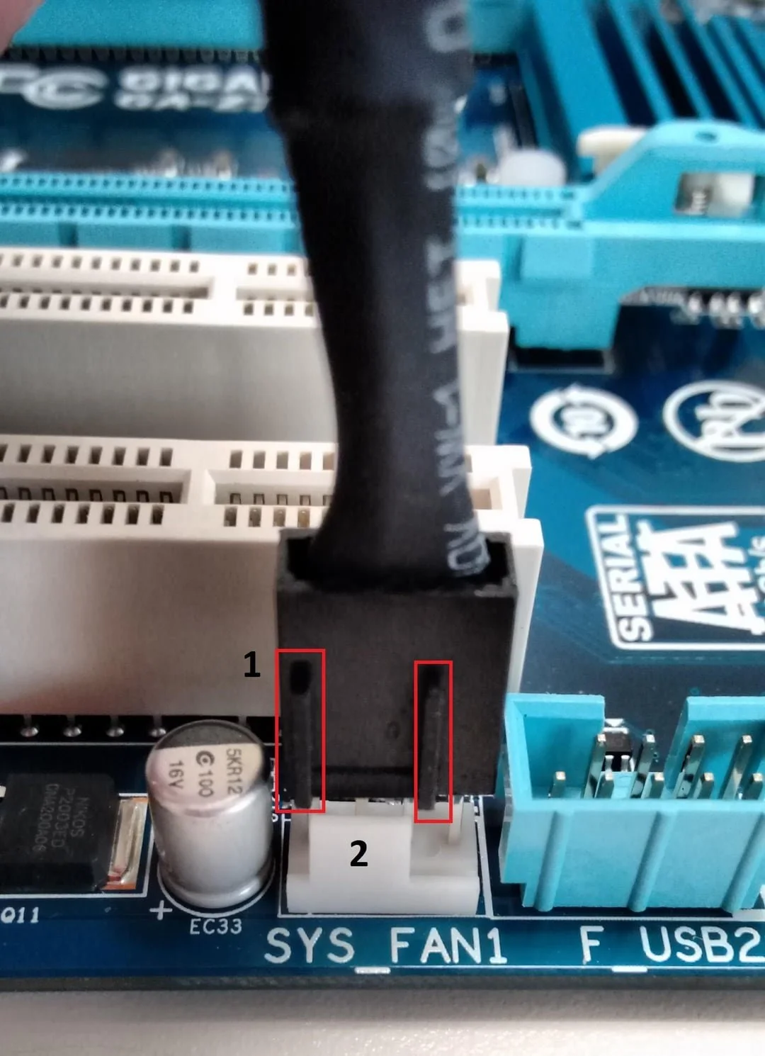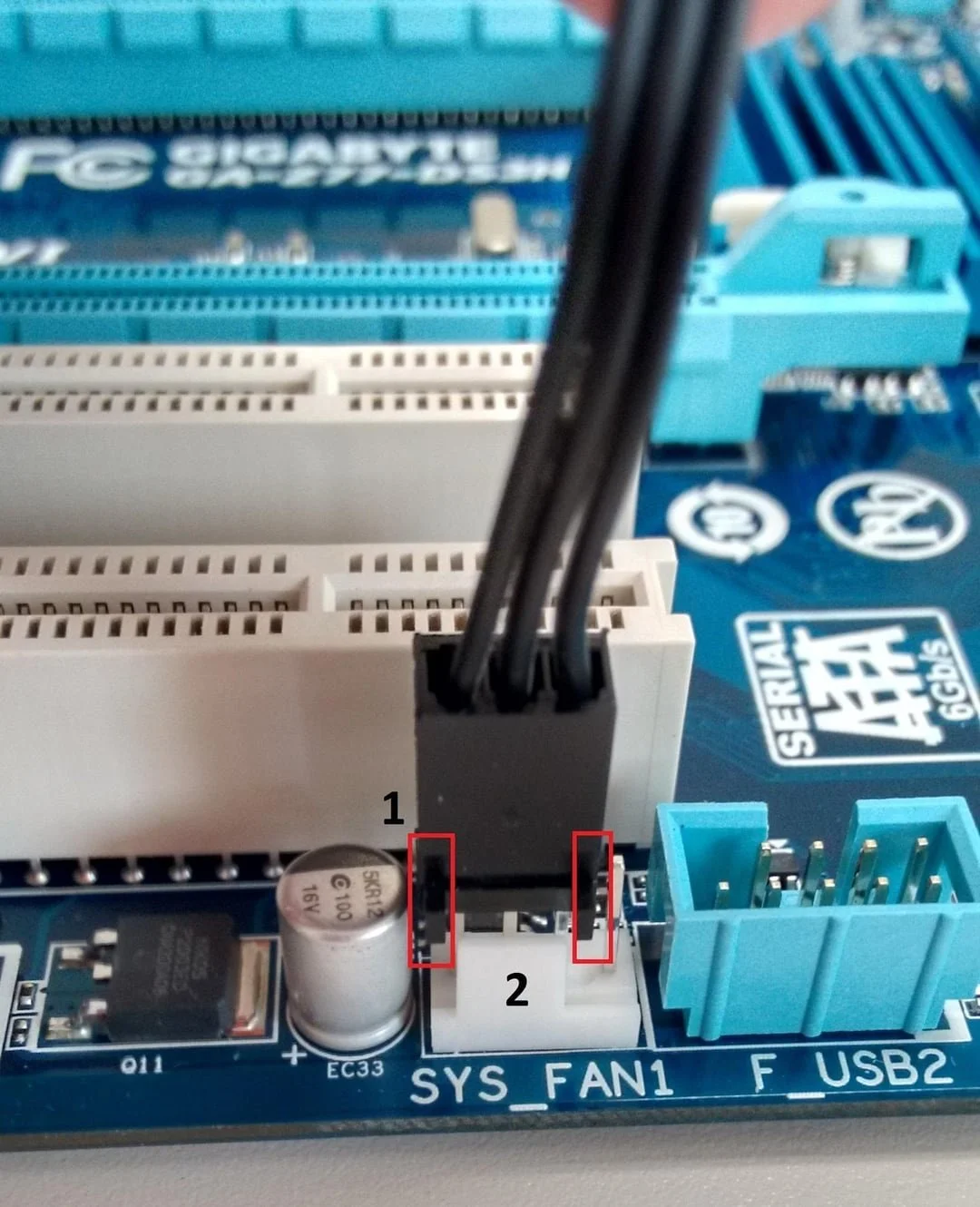 A 4-pin fan connected to a 4-pin fan header. As with the 3-pin fan, the only thing you need to do is make sure the guides are aligned and slot it in.