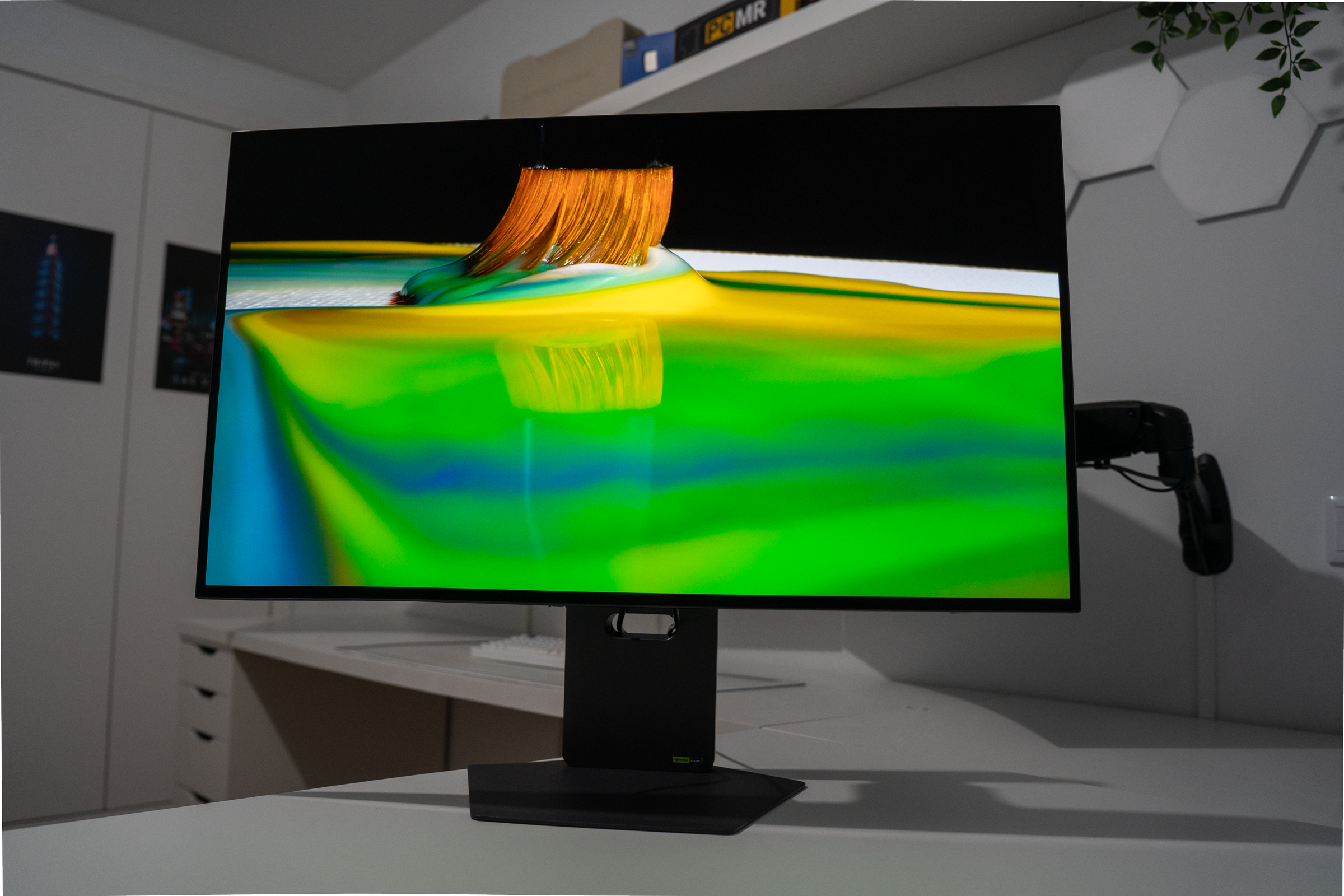 It’s a gorgeous monitor presentation. Limited branding, and a stand that matches it well, even if I prefer (and will definitely end up doing it here as well) to wall-mount my monitors.