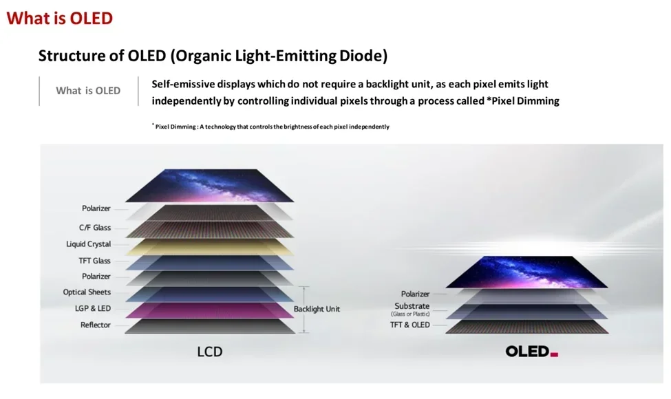LCD requires a backlight unit, while on OLED panels, each pixel ca independently emit light, and there is not backlight required. OLED can turn pixels off individually, LCDs cannot, and the spill is evident.